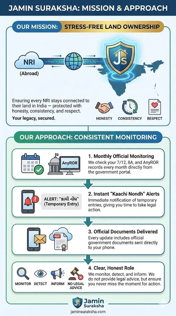 Our approach is built for NRIs who cannot check their land records every month. Anyone can download their 7/12 from the government website — but not everyone can do it consistently. That’s exactly where we help.